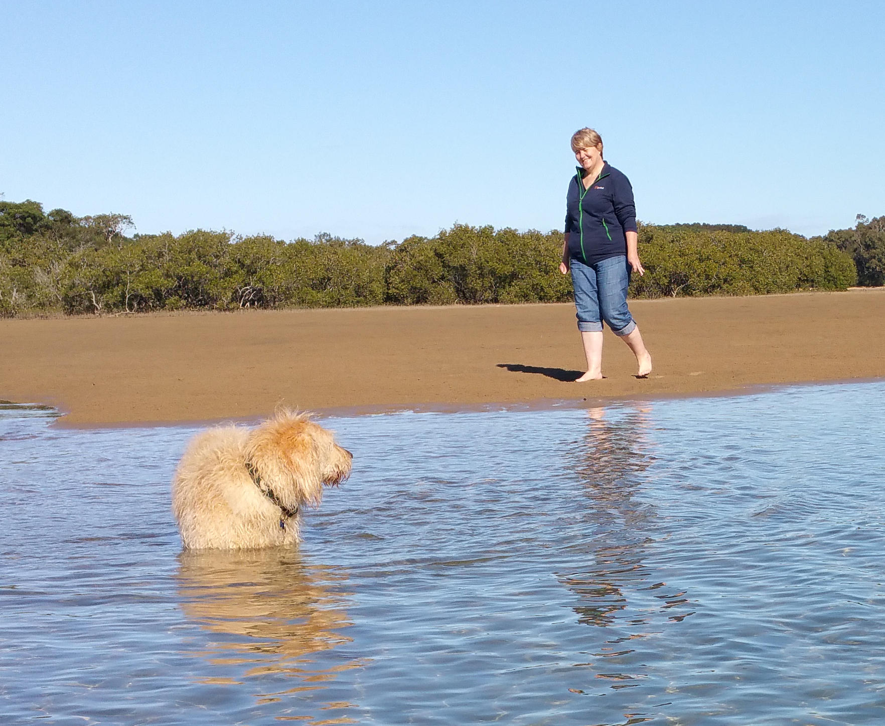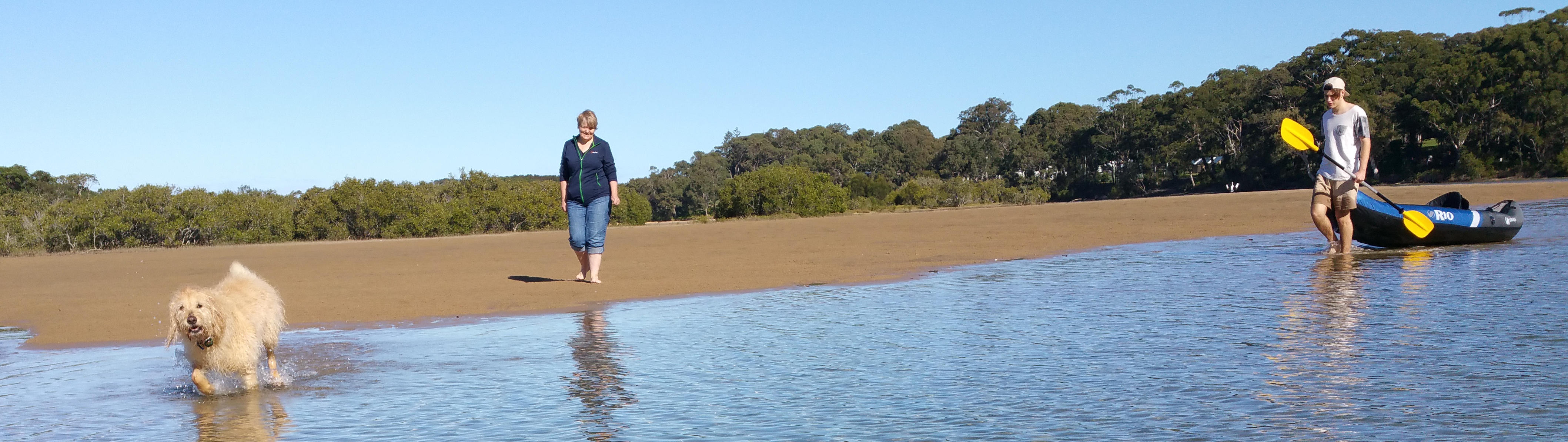Dog, Carmel and Ash walk over a sand bar