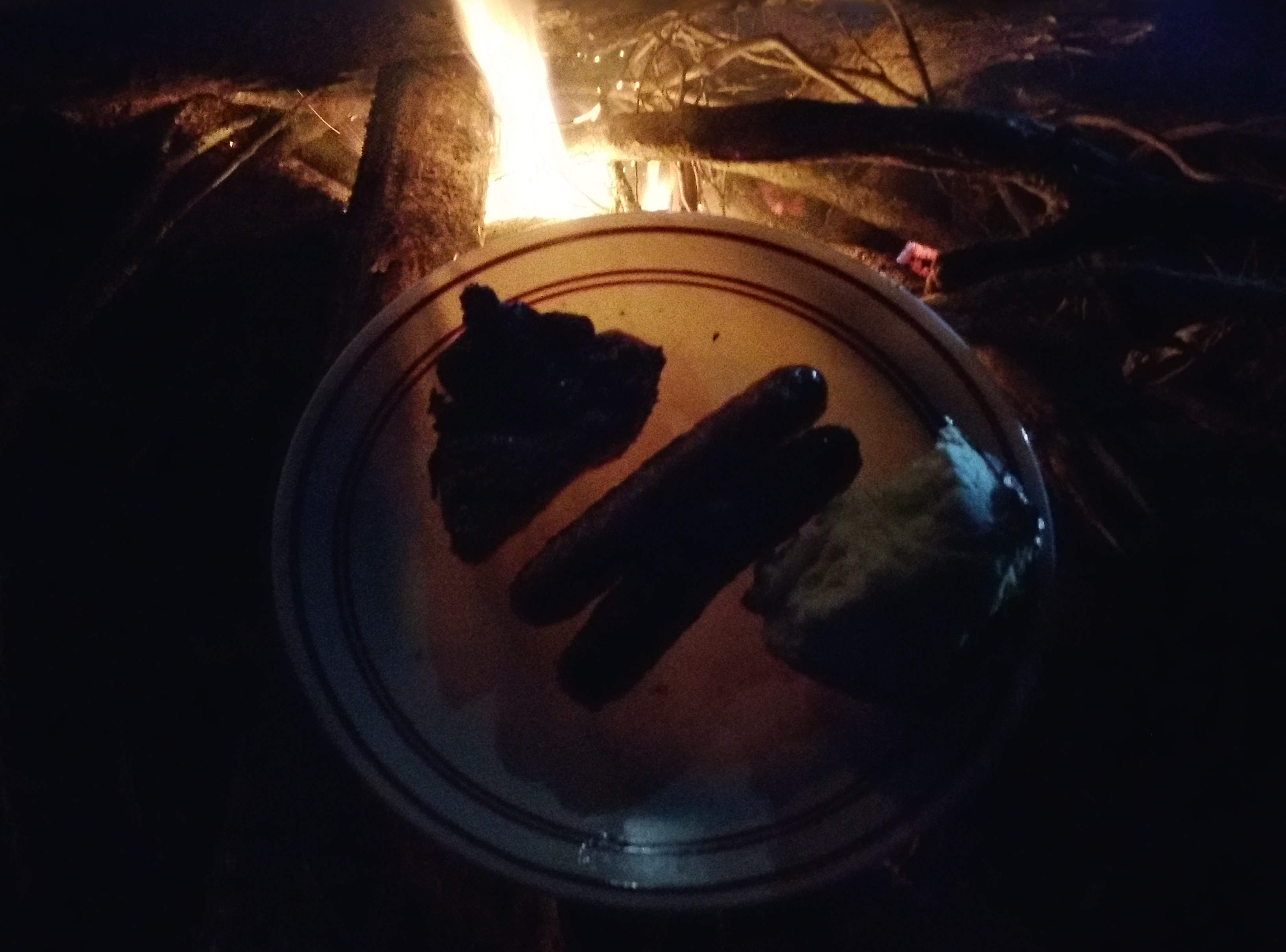 Once we had a bed of coals, the steak and sausages went on in a gridiron. (It is actually a “net iron” these days, more suitable to the explanation of chess than American Football.) Despite cooking quite quickly, it was well cooked – the steak was even a bit pink inside if our LED hurricane lamp was anything to do by. (The good old days of primus lamps with delicate mantles is long gone! I suppose my grandfather’s generation thought the same with the passing of the suicidal kerosene lamp.) So we feasted on bush tucker for dinner. Note the lack of veggies (as if I had just done a Cash Out). The truth was that by that point my fingers were numb, and I did not want to fiddle with knives and carrots. Tomorrow night I will have the veggies prepared ahead of time.