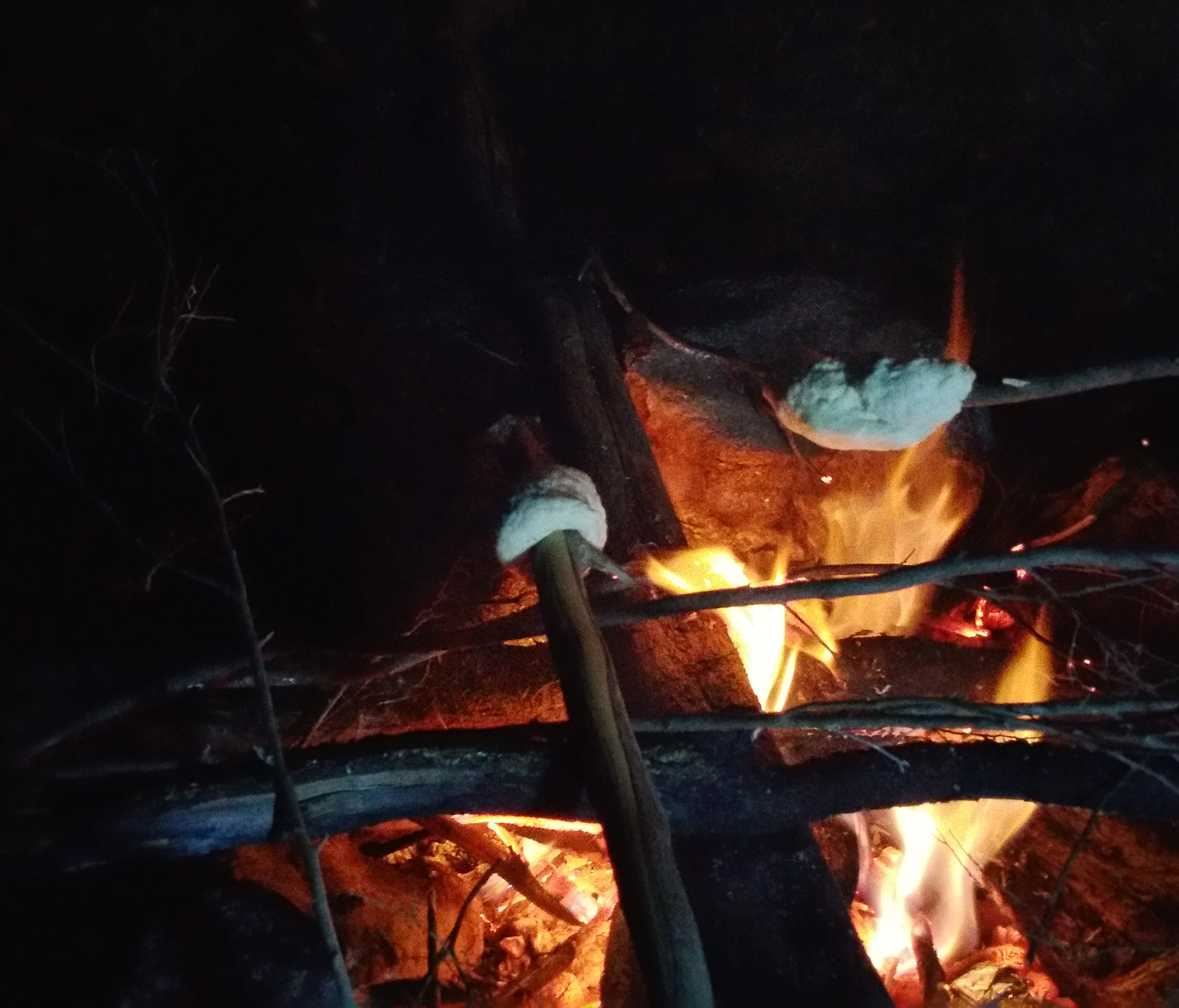 The first order of the day was damper. I have a lot of experience making damper as a teen, all of it a failure. Somehow, this time it was perfect. Perhaps it was the baking soda and extra virgin olive oil I added. (You can take the boy out of Sydney, but you cannot take Sydney out of the boy!) I made the amount for a large scone and a couple of pieces to wrap around sticks. The fire was a good one – not flaring too much because the wood was damp, so the stick cooking was only slightly burned, but fluffy and steamy in the middle.