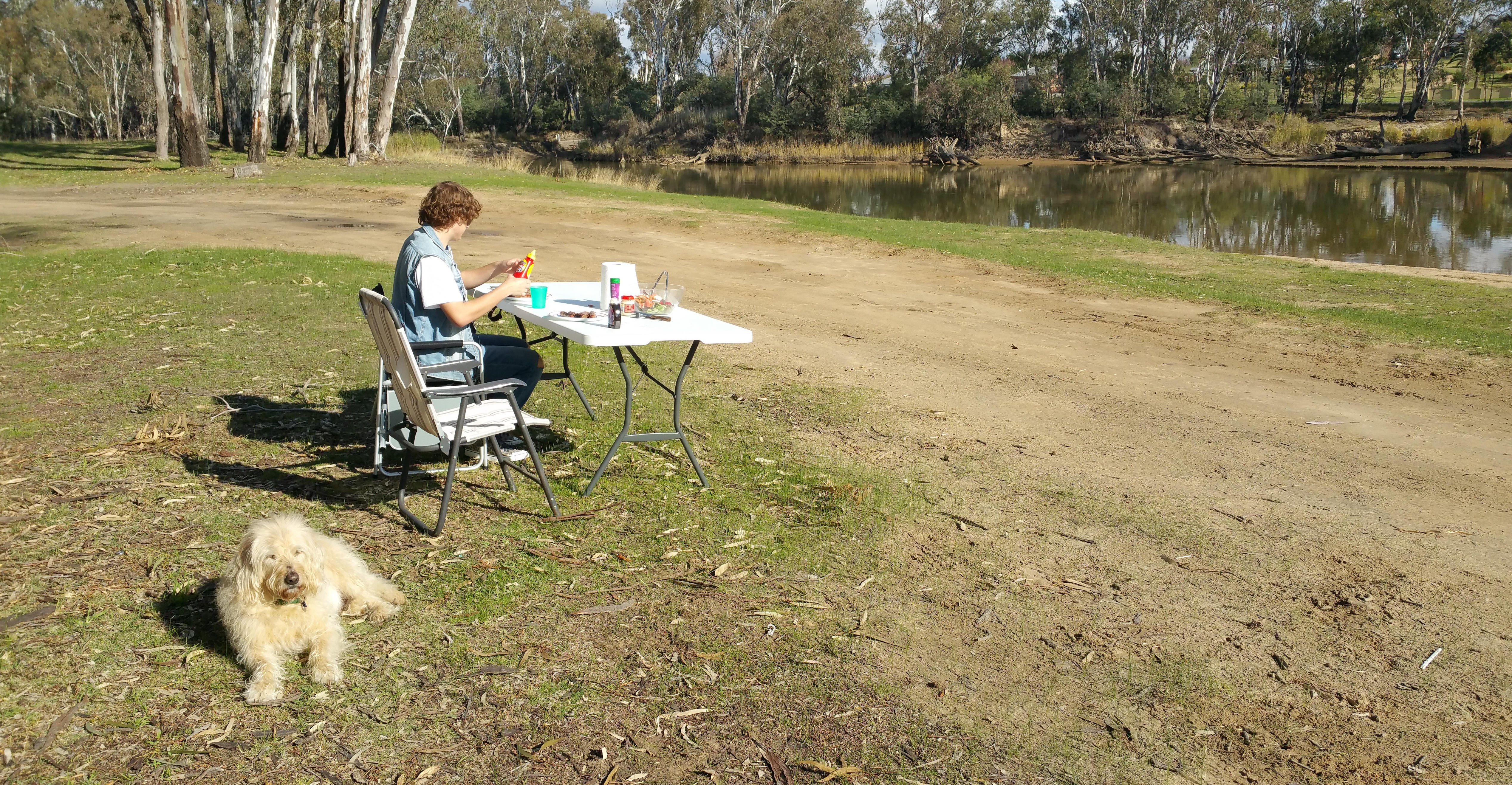 The location was Paradise Beach, an unmarked beach in Barooga State Forest on the Murray River. The place was not sign posted at all – it was off a 4WD track. I drove past it twice thinking “that is surely not it”. (We actually found it in a great book titled “Bush Camping with Dogs”. It is surprisingly well researched, and also found