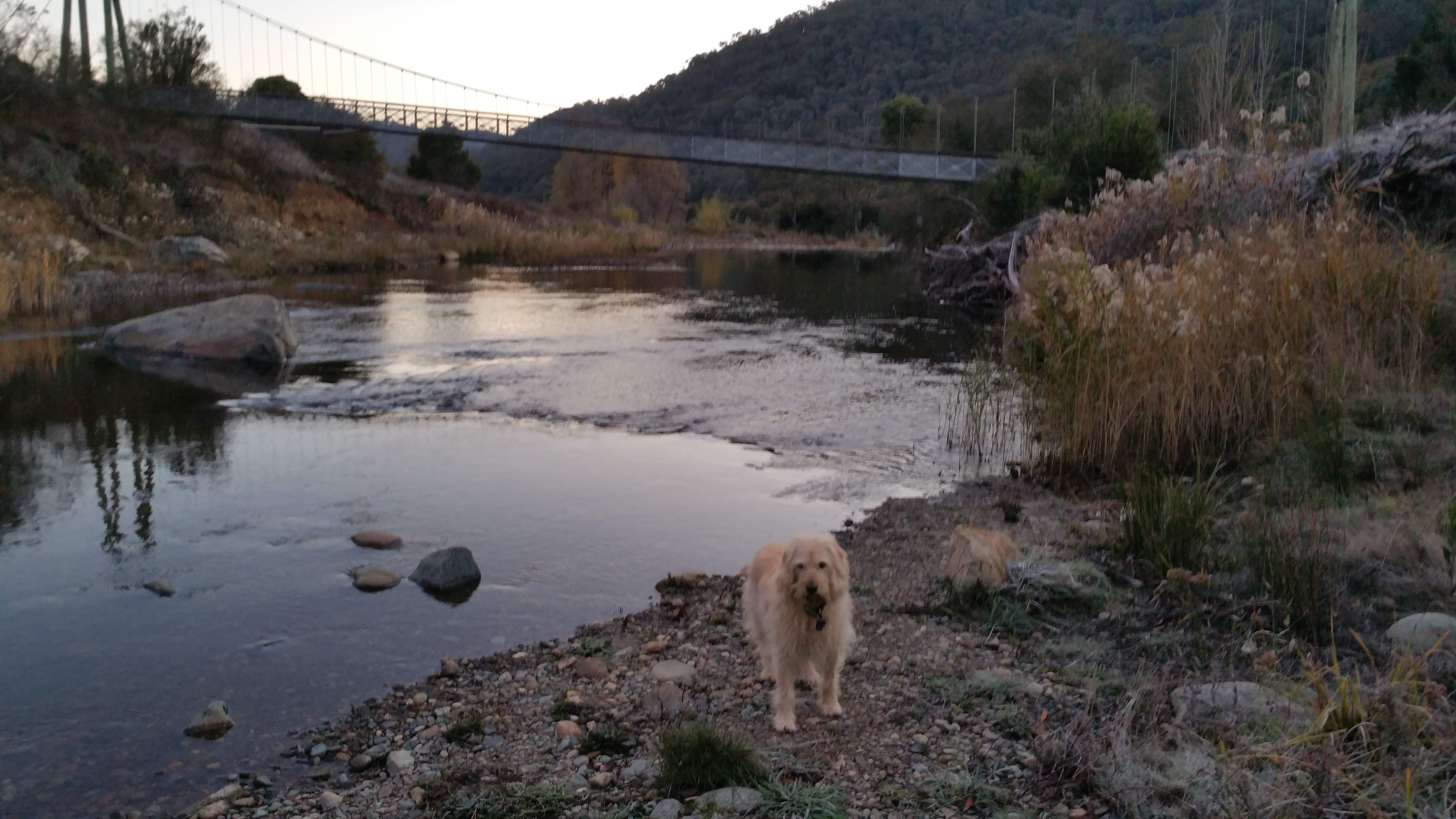 We found the camp site at Thomas Boyd Track head without too much trouble. It is at the crossing point of the Hume and Hovell Walking Track and the road to Googandra. The camp was deserted – it was the first day of winter, so I am not surprised. The sun had already set behind the hills – we were in a steep valley, so we had to make camp quickly. We had the site set up in 30 minutes (I forwent the annex) and raced around collecting the firewood along the river banks. We found plenty of kindling, but needed to drag two whole dead saplings to our fire pit. Despite the damp wood, the scout skills my parents loving foisted on me (wasn’t it really about getting rid of me for a few weekends a year) came to the fore, and we had a good fire going. Alex learned that a camp fire was a bit different from the gas fire in the TV room at home – you have to get up every 5 minutes and feed it!
