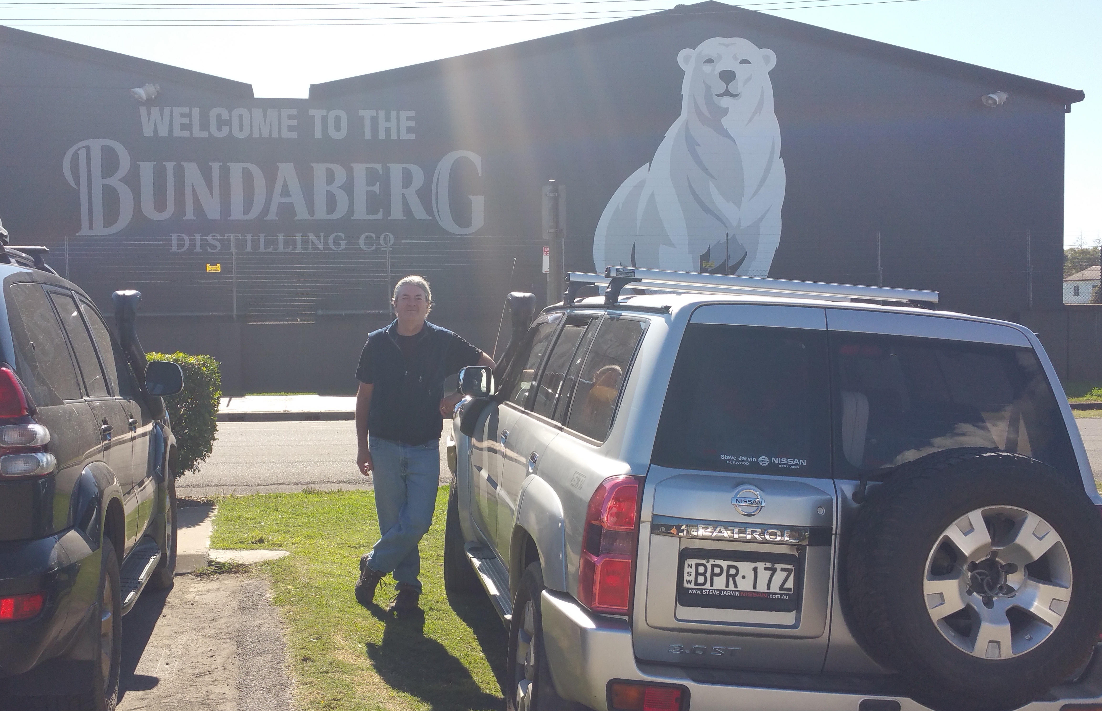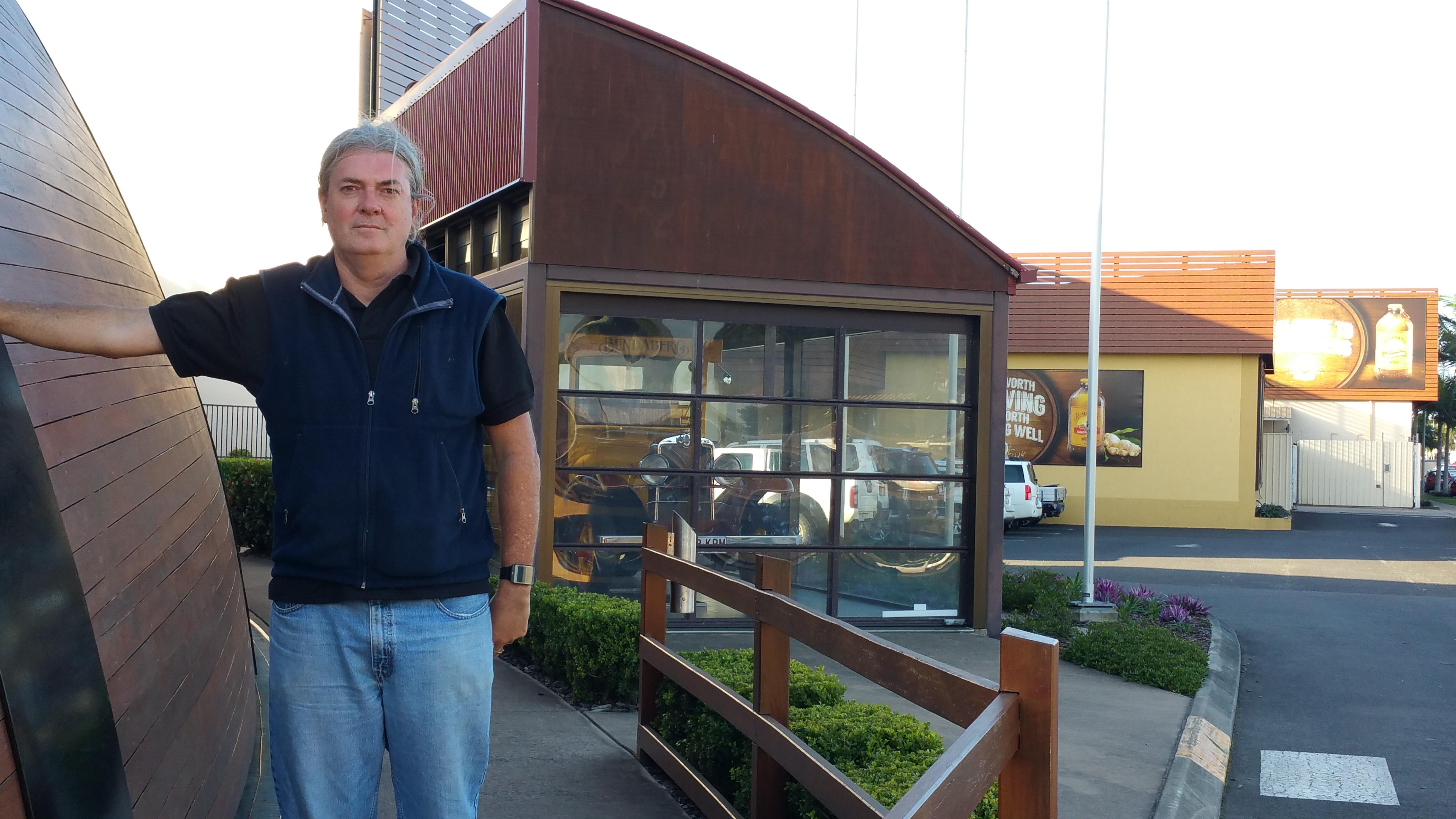 Alex leans on the famous Ginger Beer Barrel of Bundaberg, with the delivery truck and factory in the background
