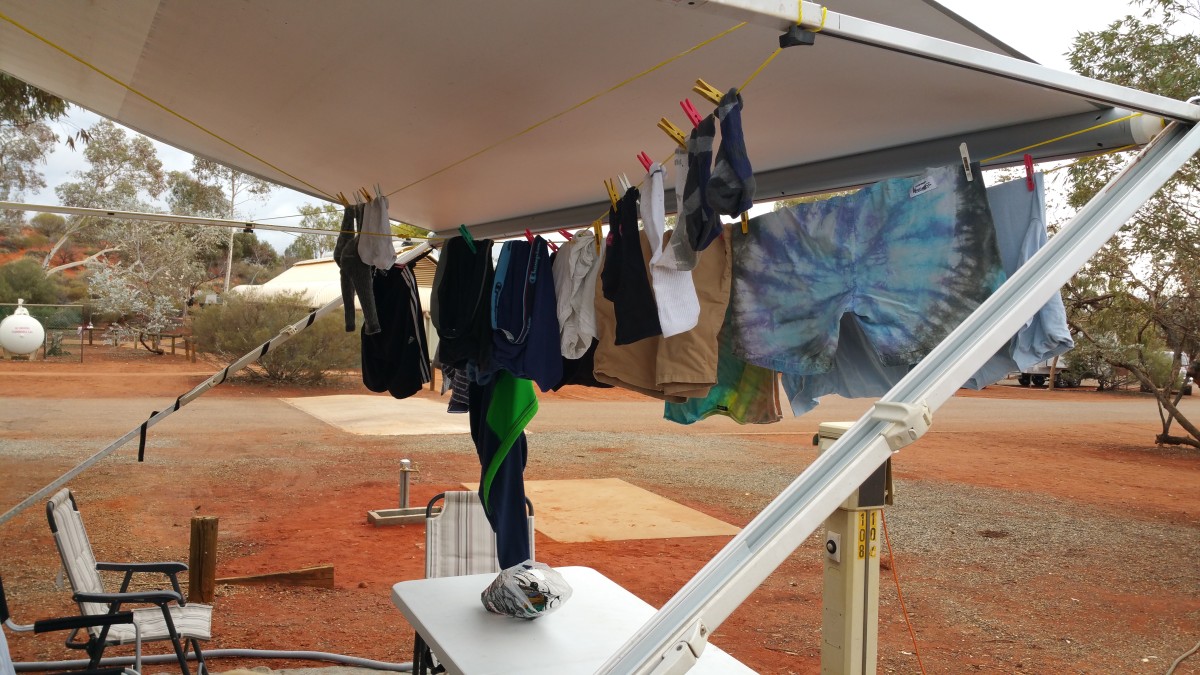 We have been very lucky with good weather. The last place we were expecting rain though was Yulara, near Uluru (Ayres Rock). It was light, but wet enough to be a nuisance. I tied our clothes line under the awning, and that did the trick.