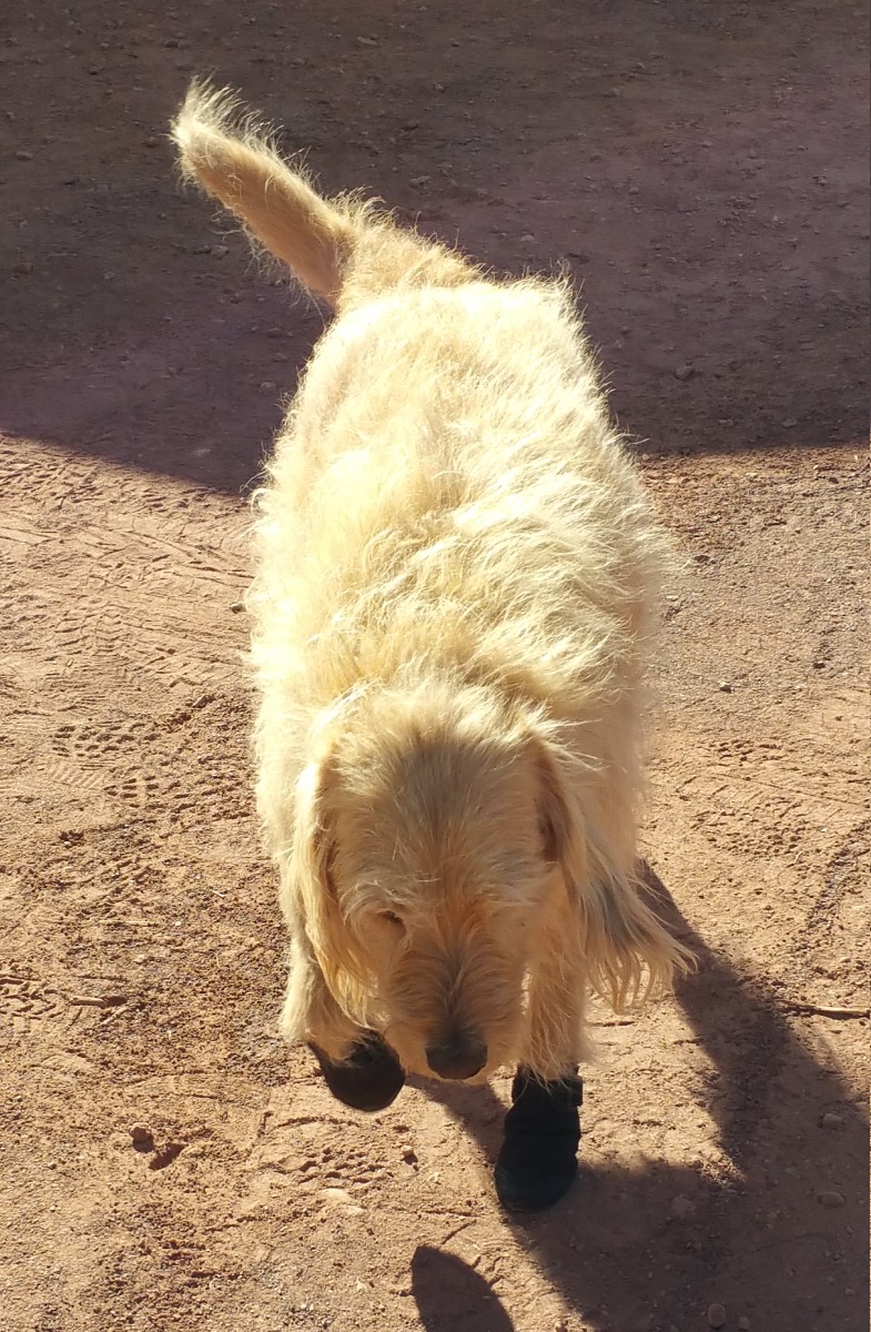 Poor dog has been finding the rocks and burrs of the Red Centre a bit hard going on his paws. We went to the vet to get advice and walked out with four small vinyl boots. After a bit of getting used to, Dog seems to have really taken to them, scampering around more than we have seen for a couple of years. Also, everyone who seems him in them comes over for a chat, so he is getting more pats too, which he loves.