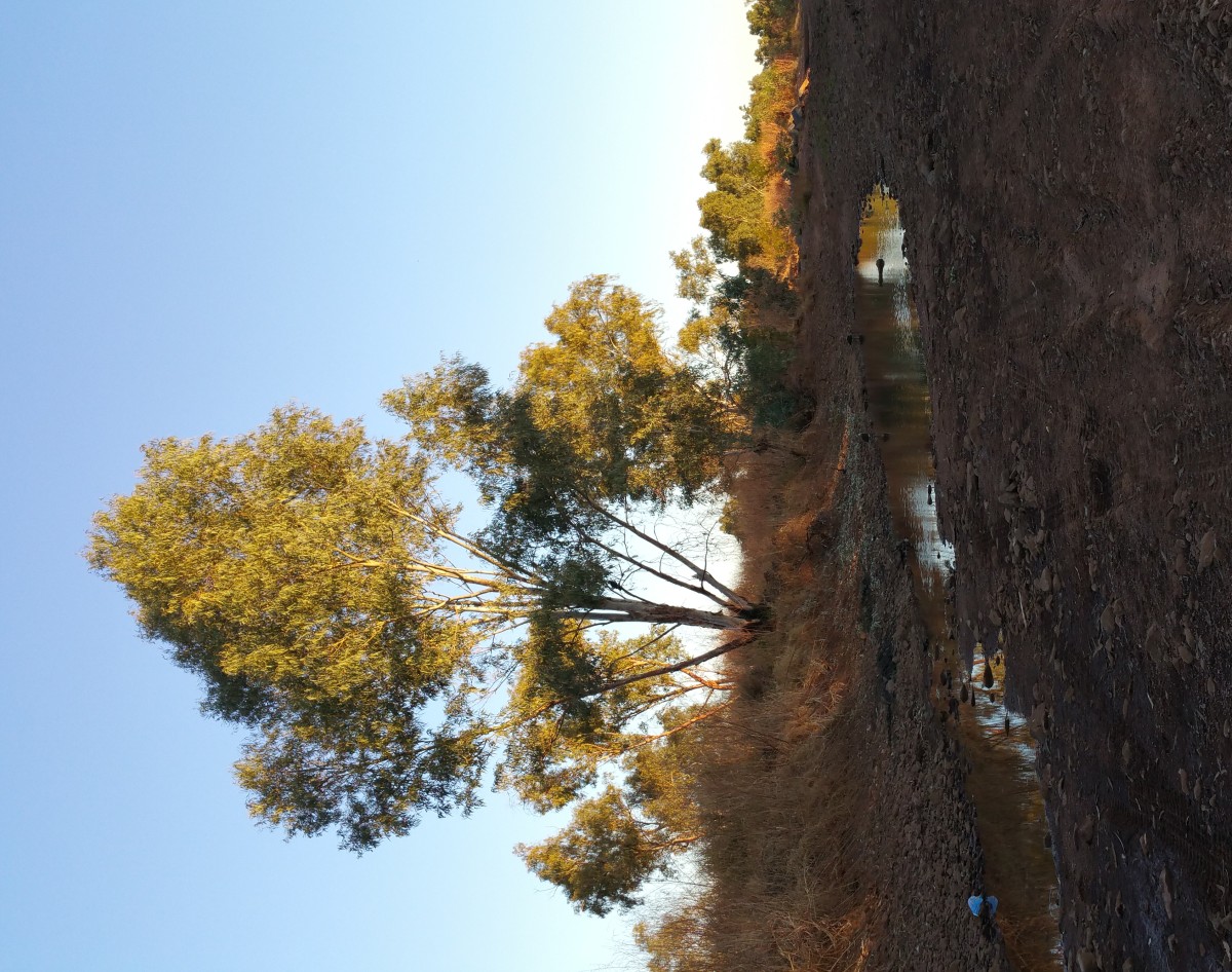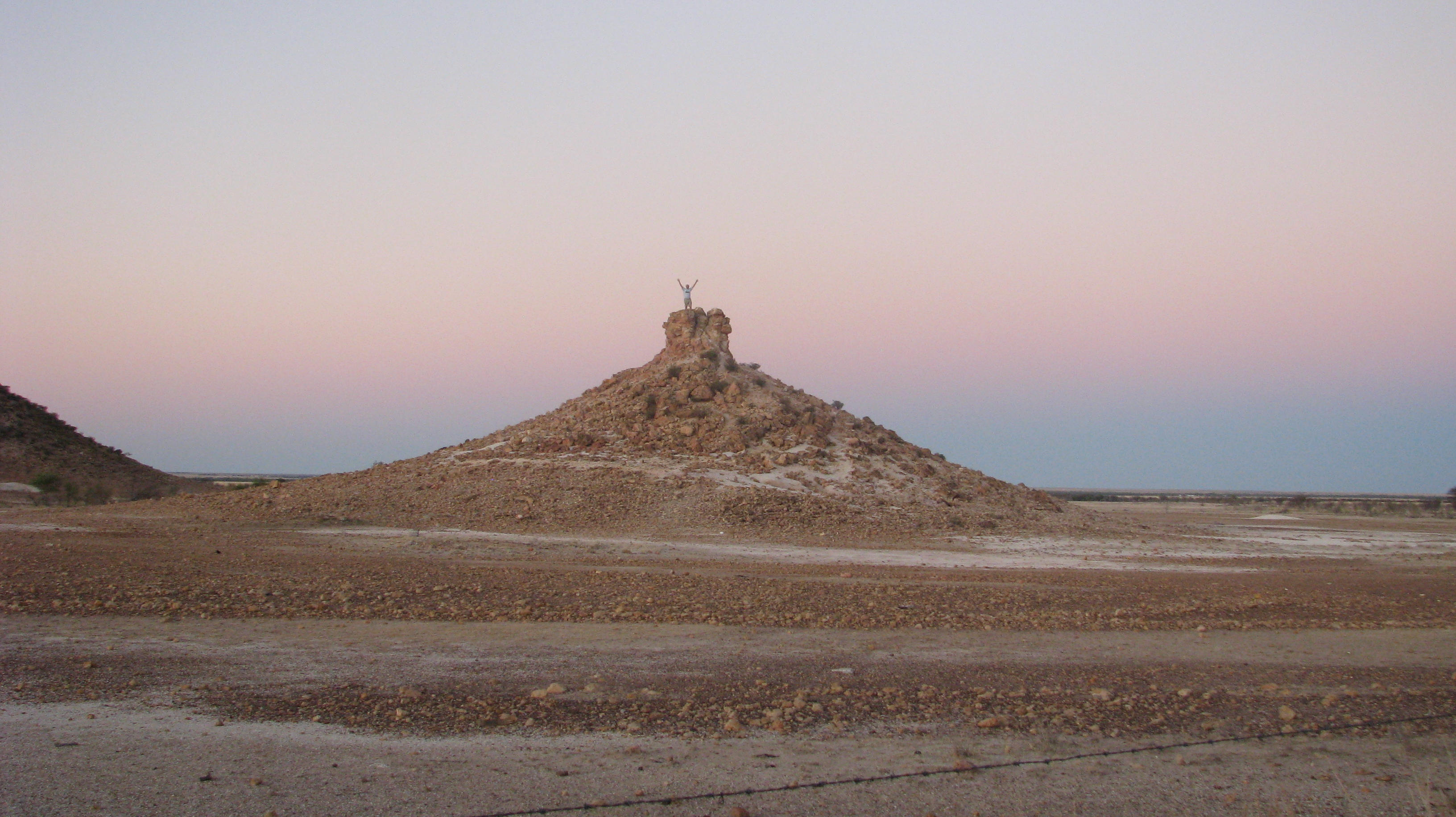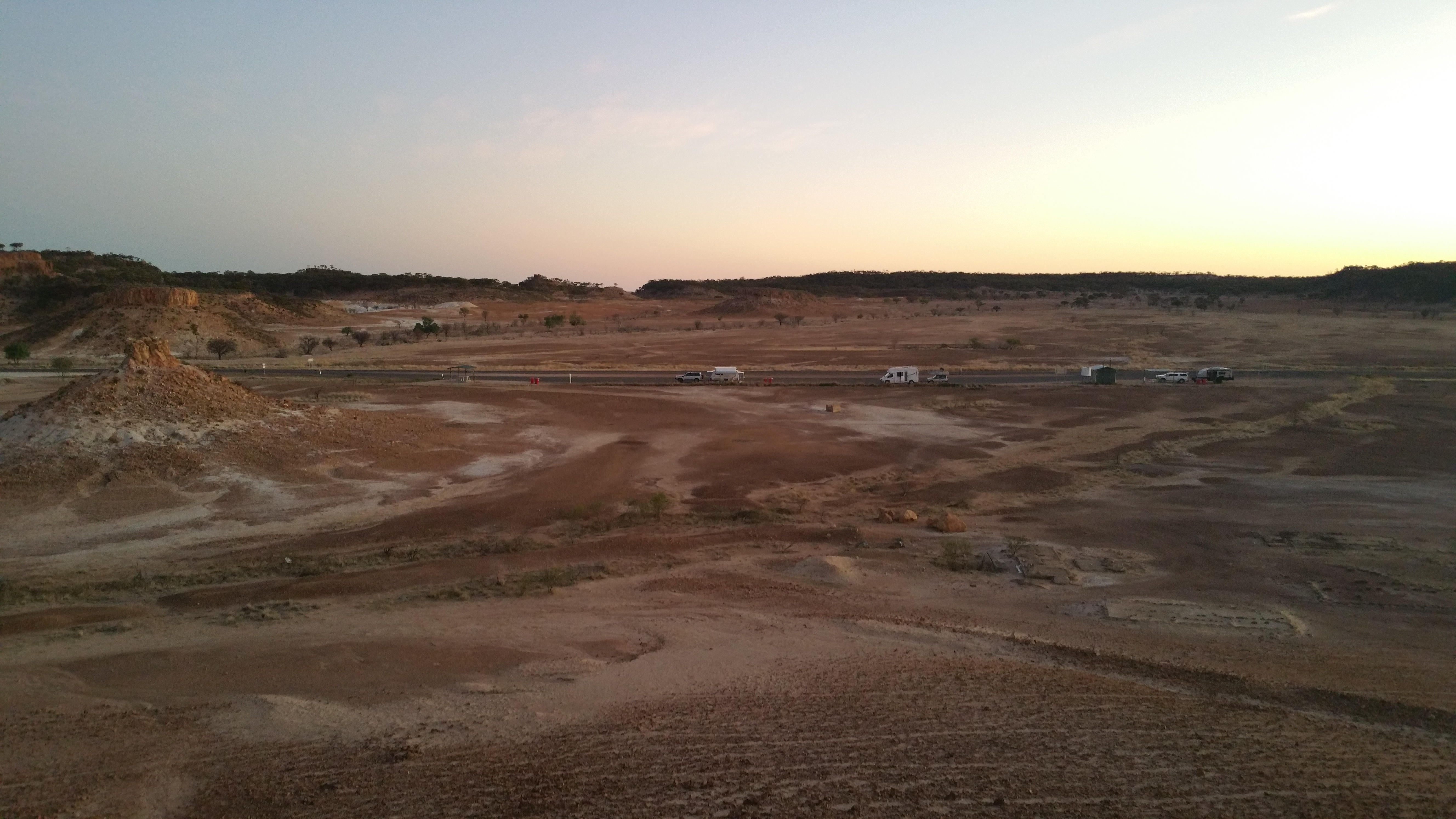 After viewing the dinosaurs, we free camped to the north of the town of Winton. It was a very barren area with climbable jump ups. Interestingly, it had rained recently as there were rivulet marks in the dust, and the smaller rocks were aligned along them.